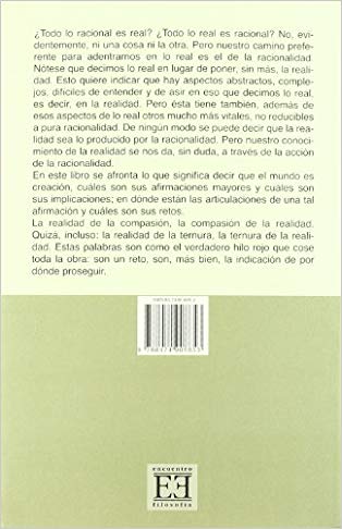 ¿Todo lo racional es real? ¿Todo lo real es racional? No, evidentemente, ni una cosa ni la otra. Pero nuestro camino preferente para adentrarnos en lo real es el de la racionalidad. Nótese que decimos lo real en lugar de poner, sin más, la realidad. Esto quiere indicar que hay aspectos abstractos, complejos, dificiles de entender y de asir en eso que decimos lo real, es decir, en la realidad. Pero ésta tiene también, además de esos aspectos de lo real otros muchos más vitales, no reducibles a pura racionalidad. De ningún modo se puede decir que la realidad sea lo producido por la racionalidad. Pero nuestro conocimiento de la realidad se nos da, sin duda, a través de la acción de la racionalidad. En este libro se afronta lo que significa decir que el mundo es creación, cuáles son sus afirmaciones mayores y cuáles son sus implicaciones; en dónde están las articulaciones de una tal afirmación y cuáles son sus retos. La realidad de la compasión, la compasión de la realidad. Quizá, incluso: la realidad de la ternura, la ternura de la realidad. Estas palabras son como el verdadero hilo rojo que cose toda la obra: son un reto, son, más bien, la indicación de por dónde proseguir.